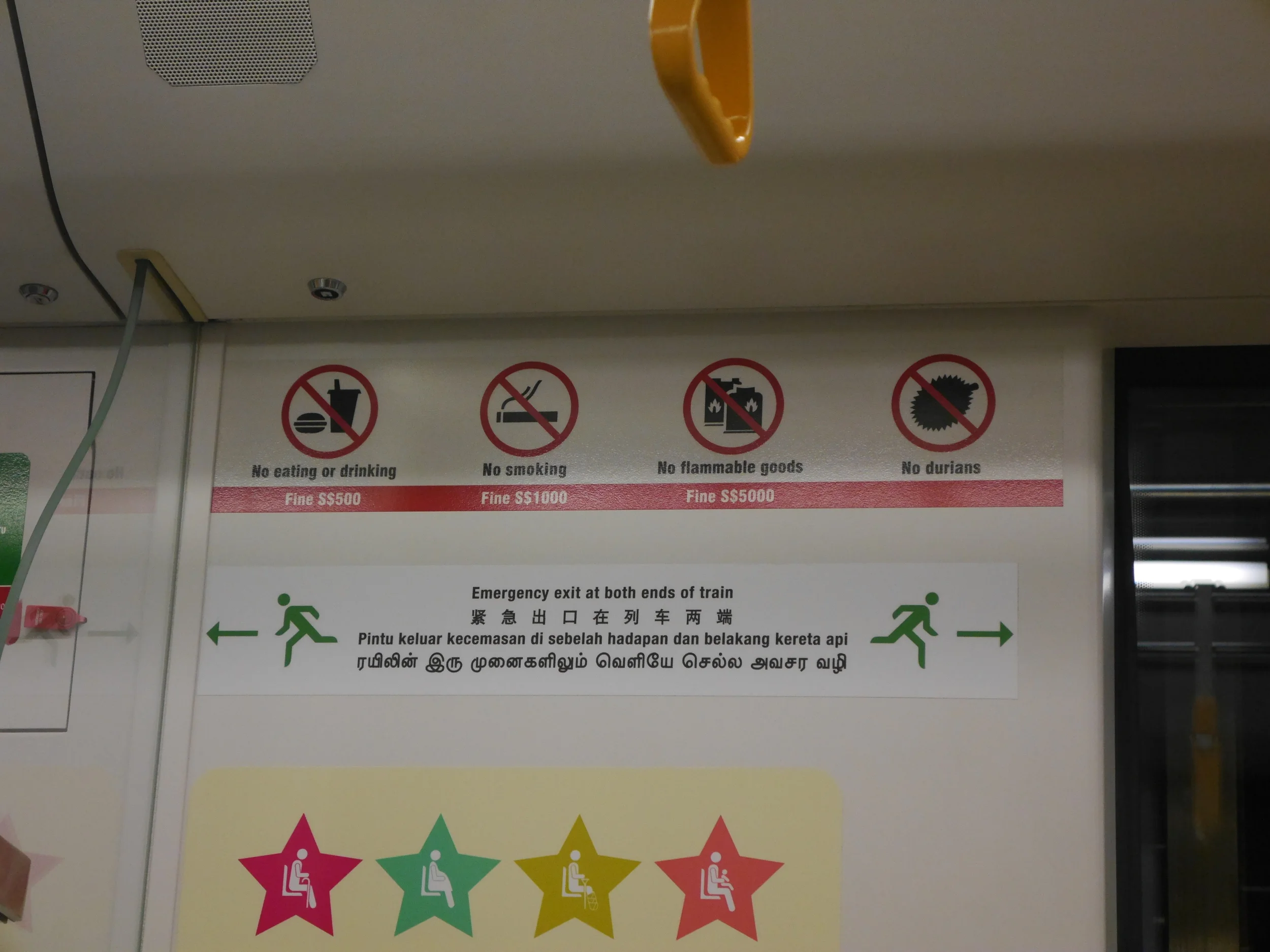 Okay, first I took this picture because "No durians." Only afterwards did I notice that, while durians are not permitted, their possession apparently carries no fine, unlike the other items. Also you can see the clearly denoted reserved seat for the elderly, pregnant, injured, or parent of small children. Or, presumably, any combination thereof.