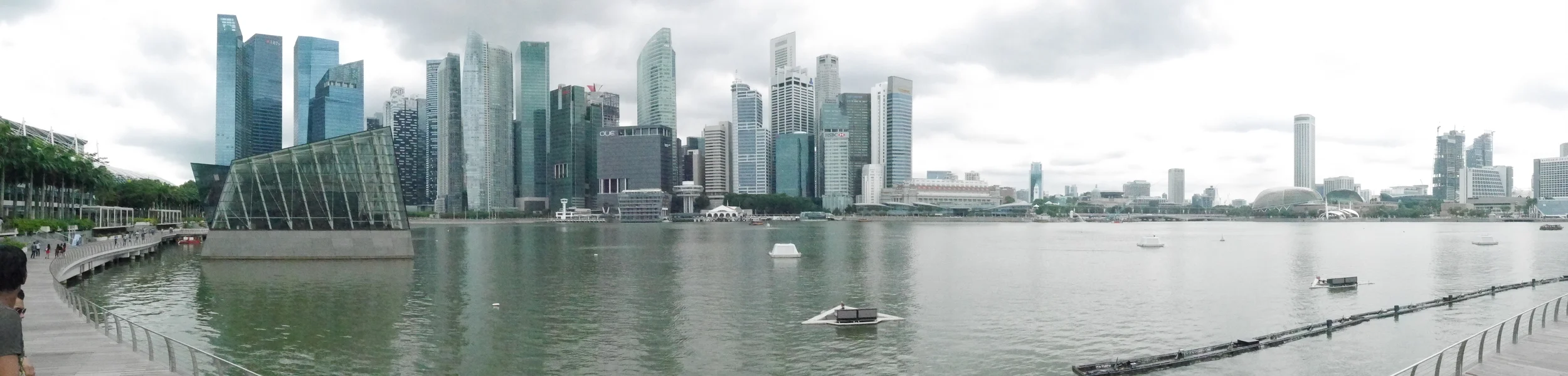 The Singapore skyline from the Marina Bay Sands shopping center. Also apparently a boat cutting through my panorama.